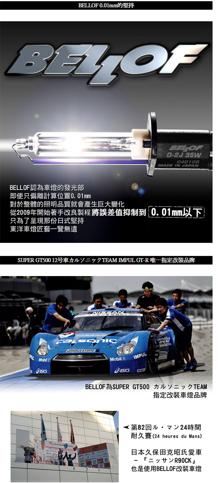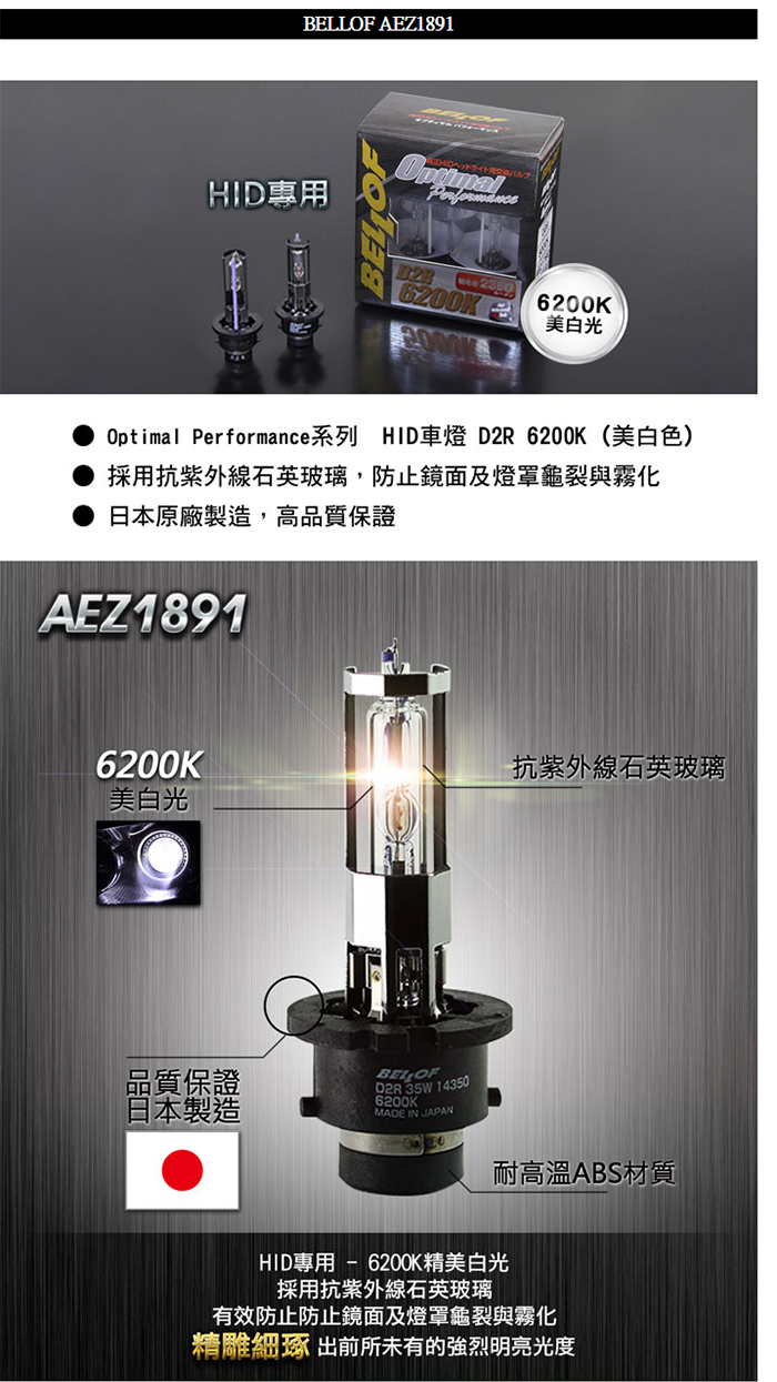 Optimal Performance系列 HID車燈 6200K 美白色 採用抗紫外線石英玻璃 防止鏡面及燈罩龜裂與霧化 全由日本生產設計及製造 品質保固一年 品牌 BELLOF型號 AEZ1891電壓 12V